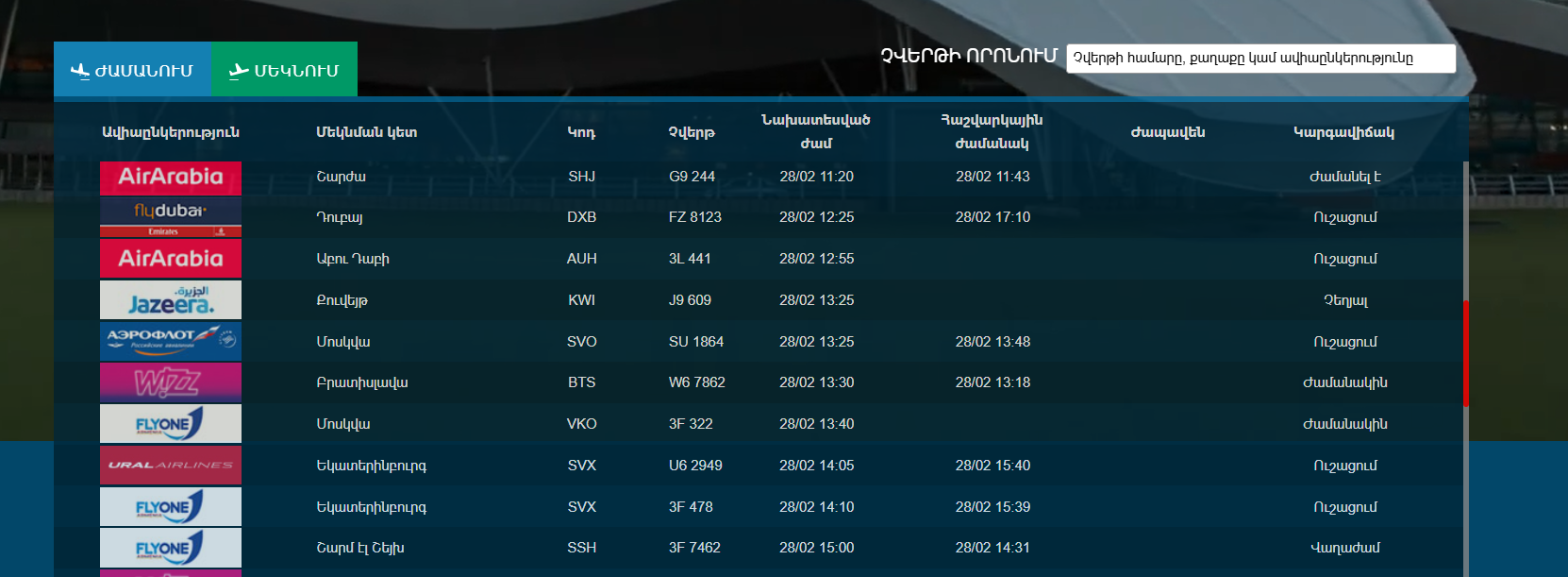 Հետաձգվել են Աբու Դաբի-Երևան, Դուբայ-Երևան չվերթները, Քուվեյթ-Երևան չվերթը չեղարկվել է․ տեղեկանում ենք «Զվարթնոց» օդանավակայանի չվացուցակից։
