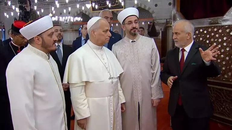 Հռոմի պապը Կապույտ մզկիթ մտնելուց առաջ հանել է կոշիկները։ Այցի ընթացքում մզկիթի մուեձին Աշգըն Թունջան Լևոն XIV-ին անգլերեն պատմել է մզկիթի պատմության և ճարտարապետության մասին։