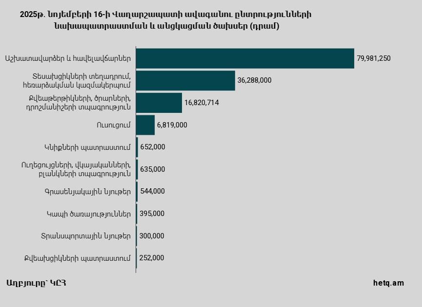«Согласно информации, предоставленной Hetq Центральной избирательной комиссией, на выплату заработной платы выделено 79 миллионов 981 тысяча драмов. На установку камер в участковых избирательных комиссиях и 47 территориальных избирательных комиссиях, а также на организацию трансляции процесса голосования было выделено 36 миллионов 288 тысяч драмов.