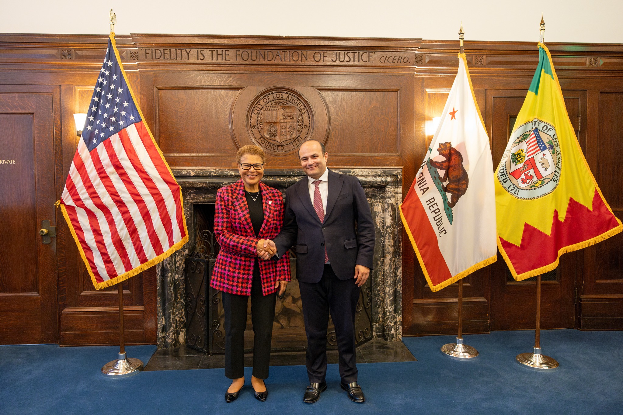 В ходе рабочего визита в Калифорнию посол Армении в США Нарек Мкртчян встретился с мэром Лос-Анджелеса Карен Бассом, сообщает посольство Армении в США.